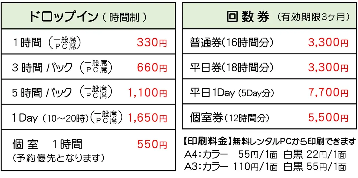 | 平日フルタイム会員 (平日10:00~20:00) | 11,000円/月 |